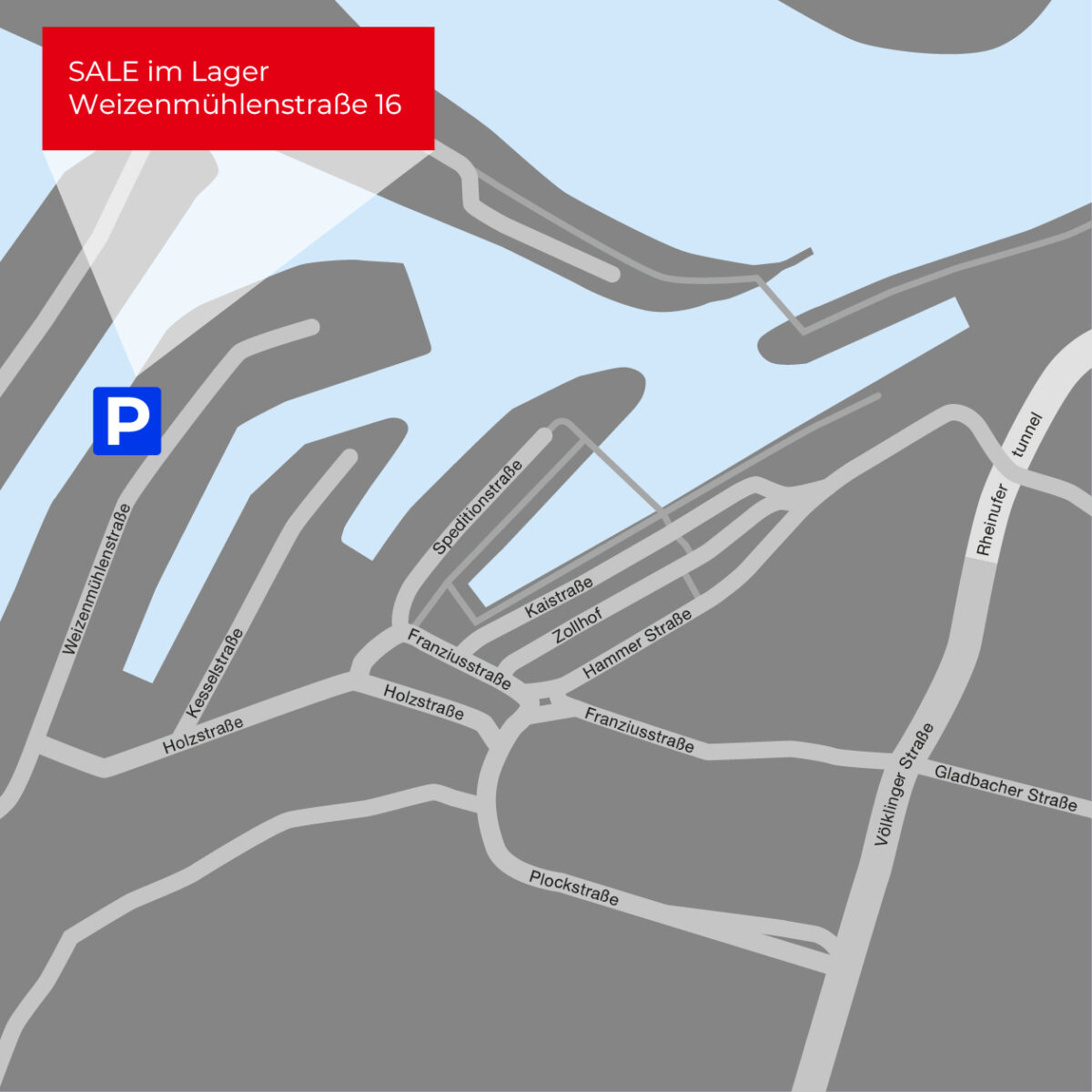 Ausreichend Parkplätze sind auf der Weizenmühlenstraße, direkt vor unserem Lager oder auch auf der Kesselstraße vorhanden