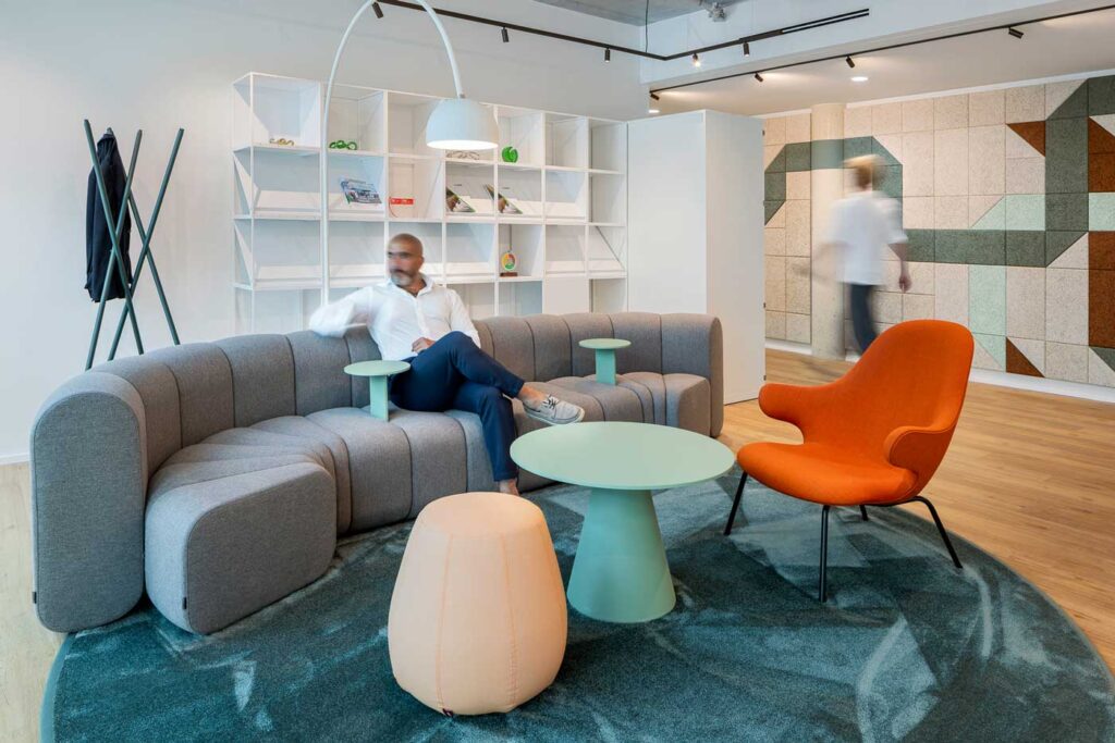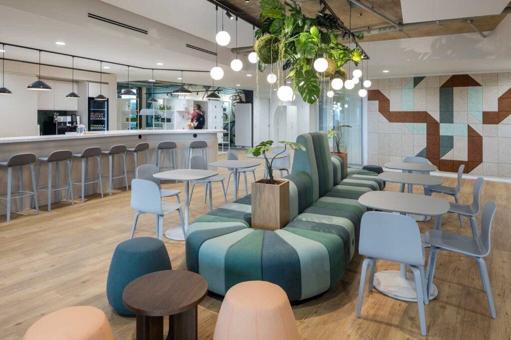 Das Arbeitskonzept folgt dem Prinzip des Activity Based Working: Entspannung und Produktivität sind bewusst miteinander verwoben. Herzstück ist die Community Kitchen mit Bar- und Loungebereichen als Ort für Begegnung und Austausch.