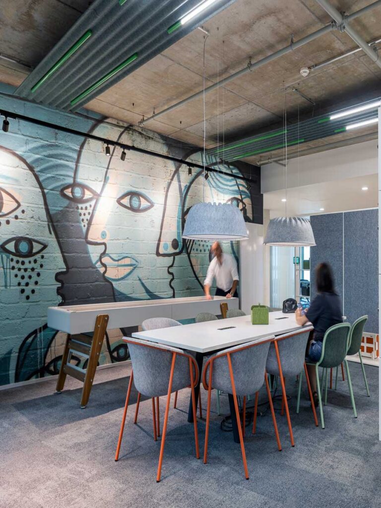 Das Design stellt subtil den Bezug zur Bahninfrastruktur her: Akustikpaneele, Schienenbeleuchtung und Möbel mit Anklängen an das Schienennetz leiten durch die Fläche. Themen wie Stadt, Land, Fluss prägen die Gestaltung – Graffiti-Motive erinnern an Bahnhöfe, organische Formen, stilisierte Vögel und hängende Gärten bringen Natur ins Innere.