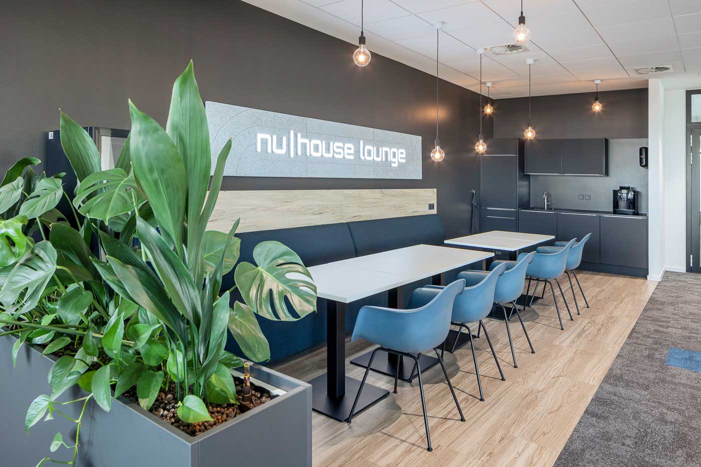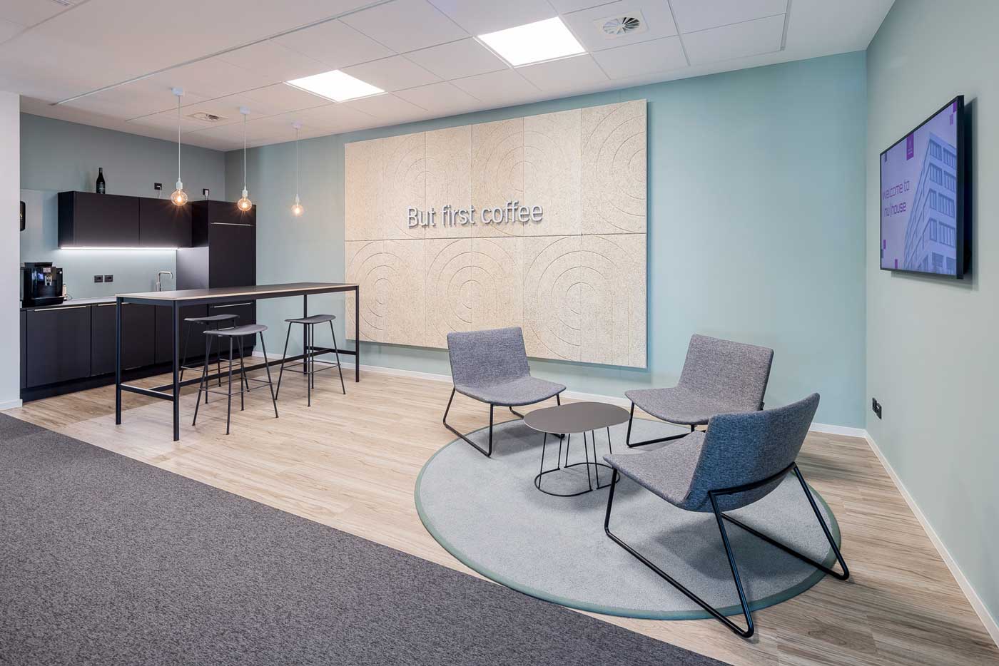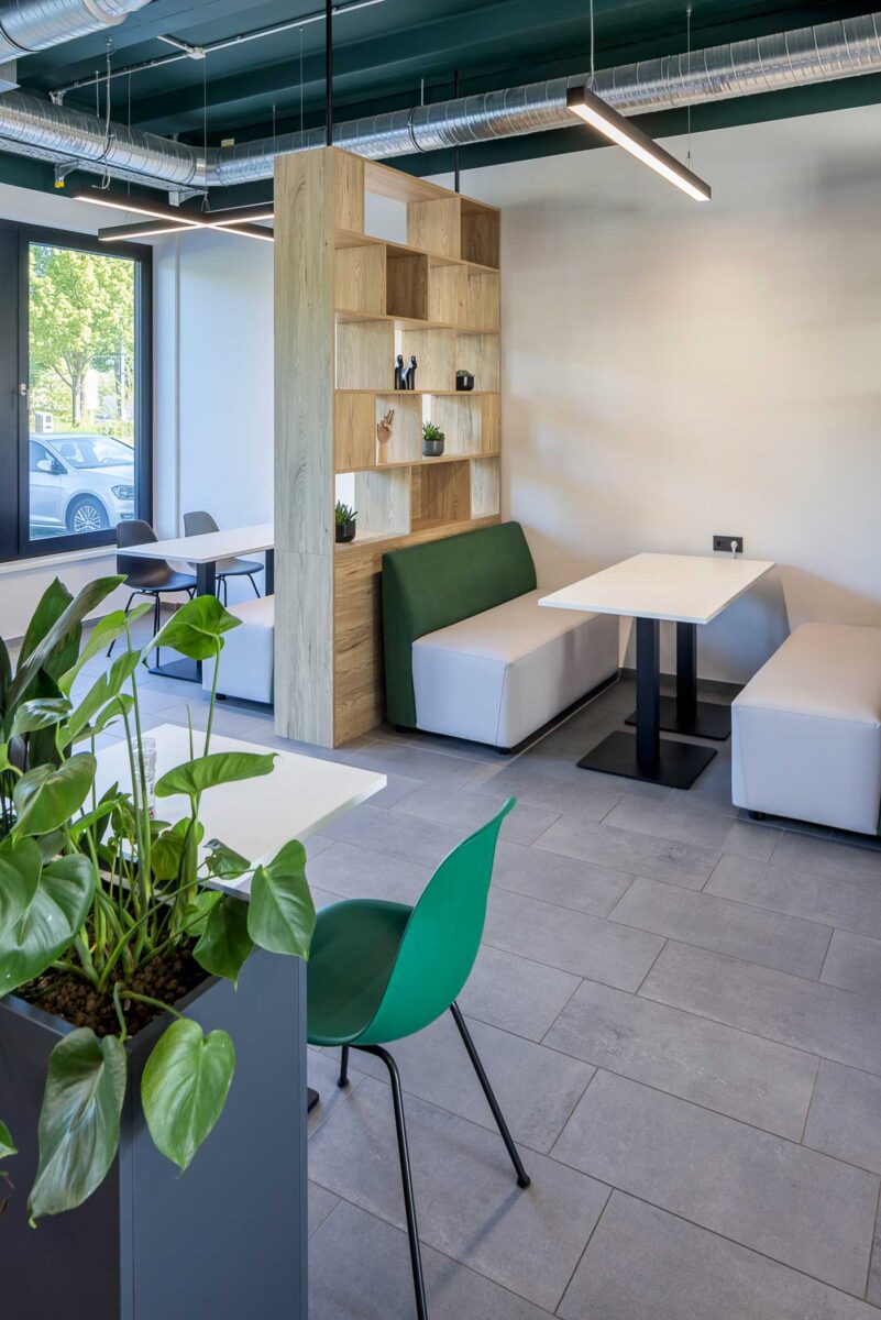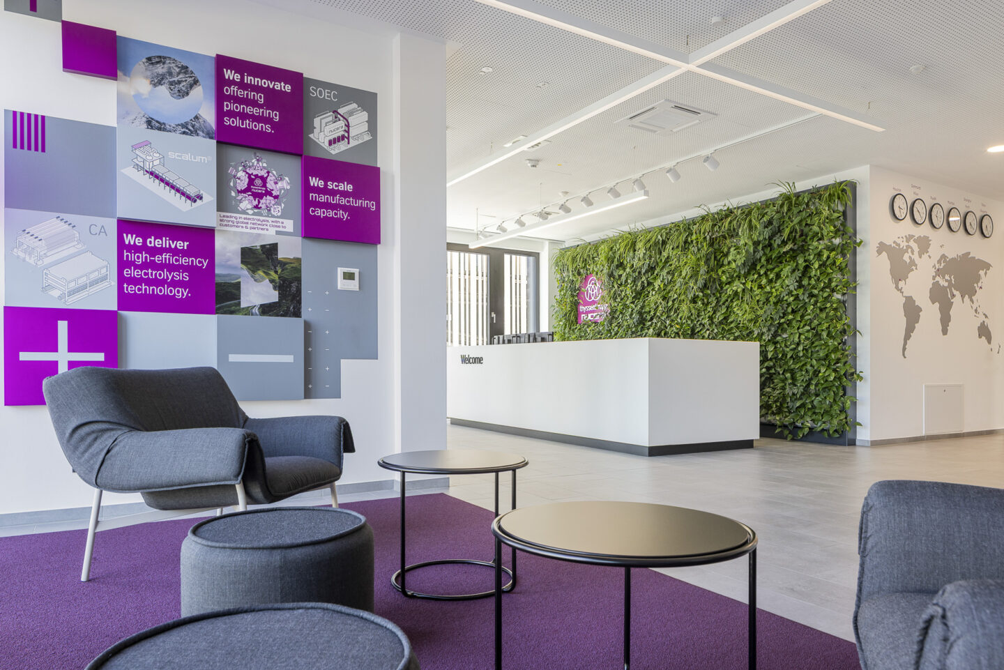 Im Eingang finden wir in den CI-Farben von thyssenkrupp nucera eine Welcome-Area mit Wartebereich. Daran schließt ein großzügiger Bistro-Bereich an, der in Grüntönen gehalten ist und mit echten Pflanzen zu einer Oase wird. Akustik-Paneele an der Decke und ein Akustikbild an der Wand sorgen für eine angenehme Raumakustik.