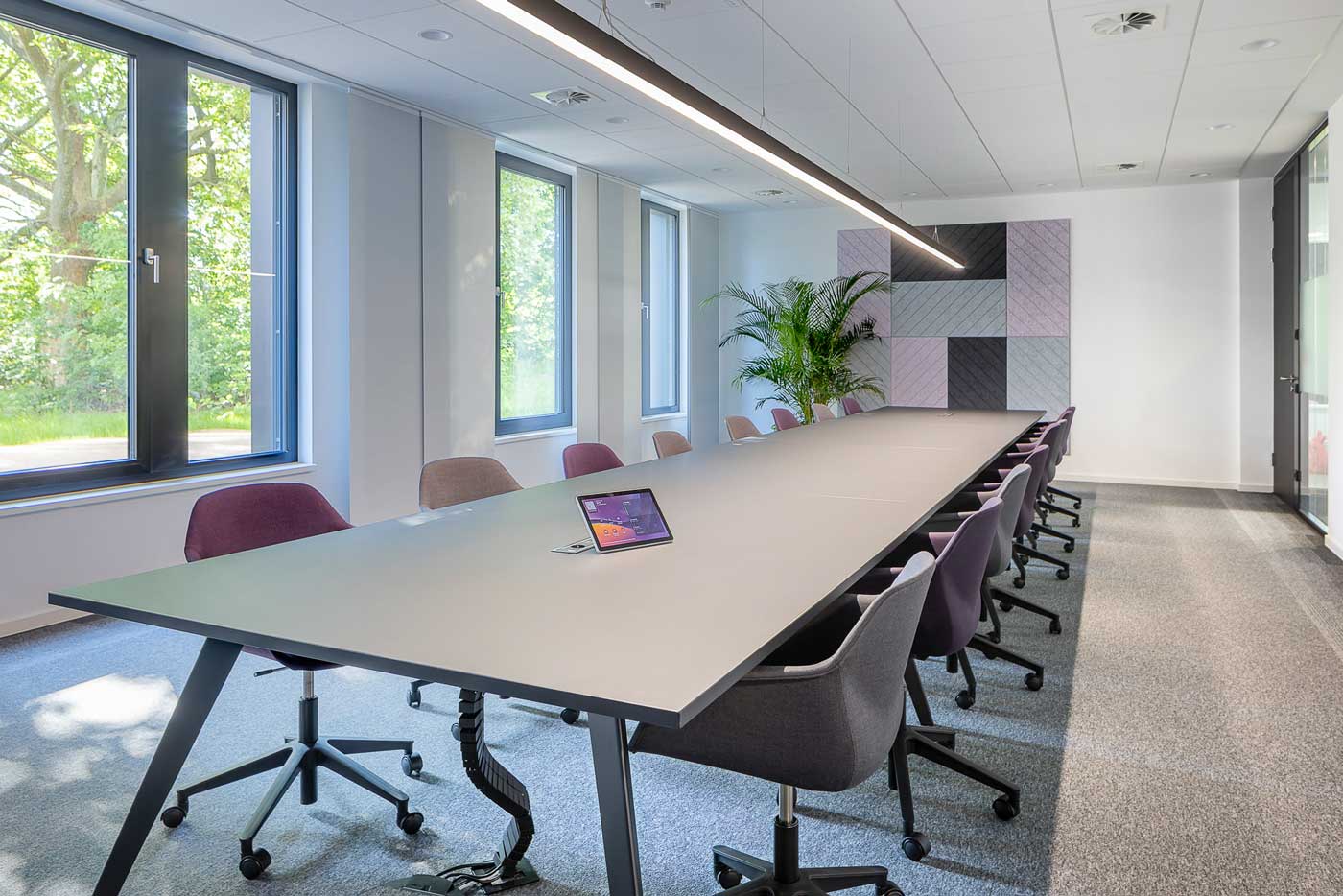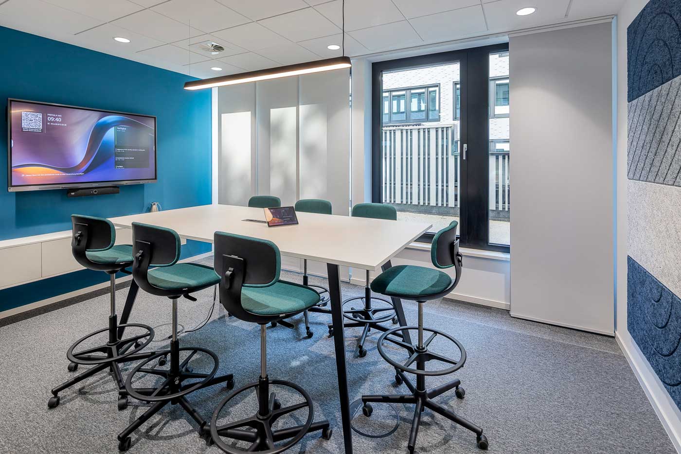 In den Meeting-Räumen findet sich in jedem Raum eine akustisch wirksame Wandgestaltung, die variiert und immer eine andere Farbigkeit hat.