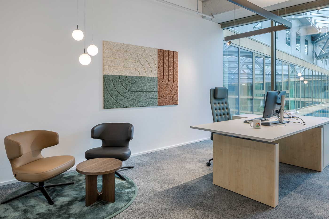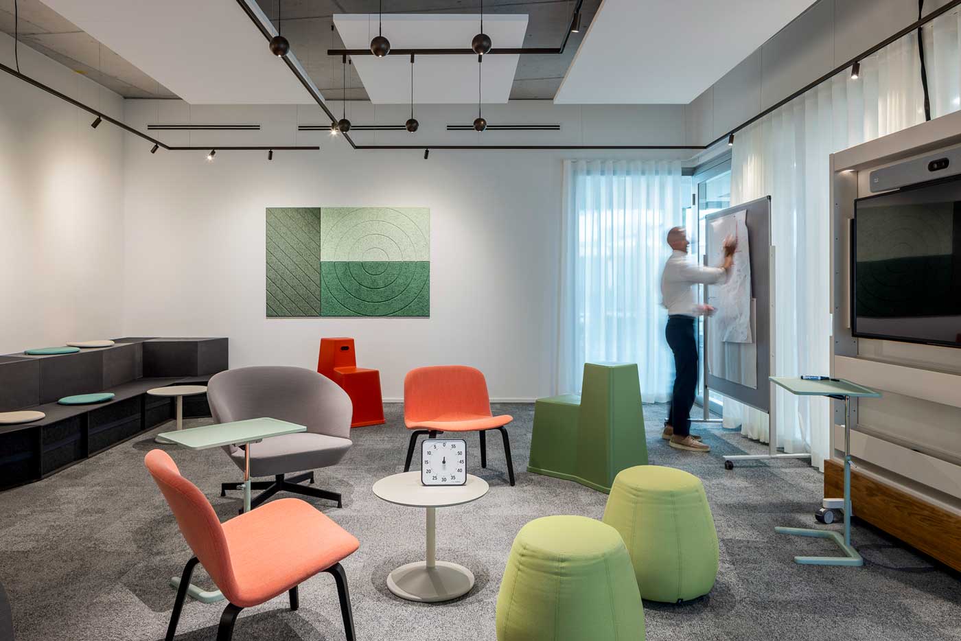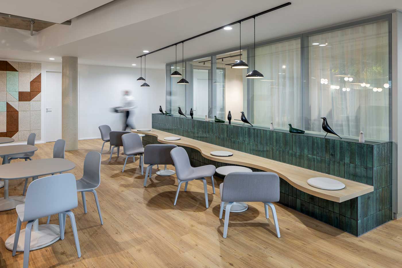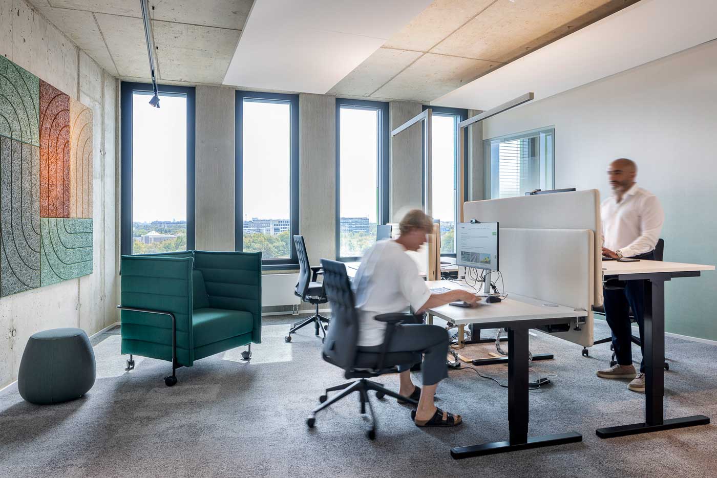 Die Arbeitslandschaft lädt zum Entdecken ein. Dabei stellt das Design subtil den Bezug zur Bahninfrastruktur her. Akustikpaneele, Schienenbeleuchtung und Möbel mit Anklängen an das Schienennetz leiten durch die Fläche. Themen wie Stadt, Land, Fluss prägen die Gestaltung: Graffiti-Motive erinnern an Bahnhöfe, organische Formen von Bänken, stilisierte Vögel und hängende Gärten bringen Natur ins Innere.