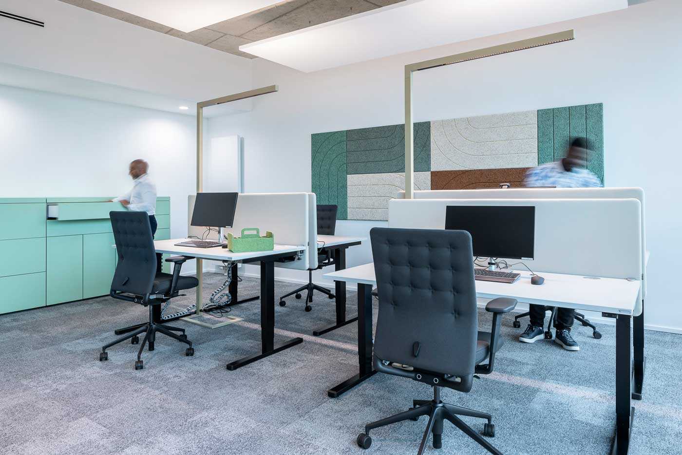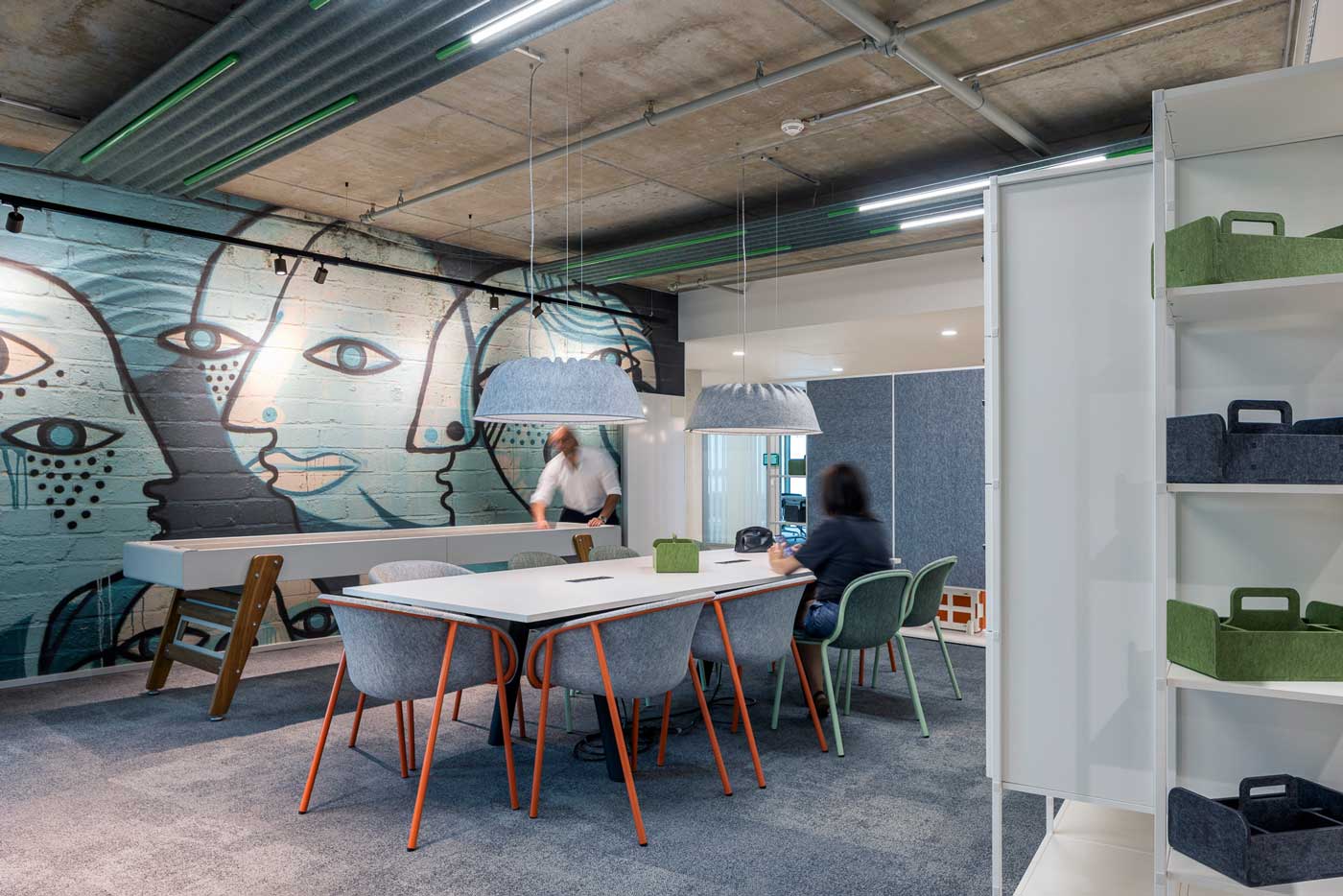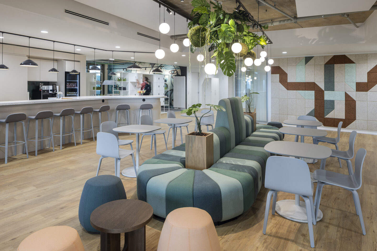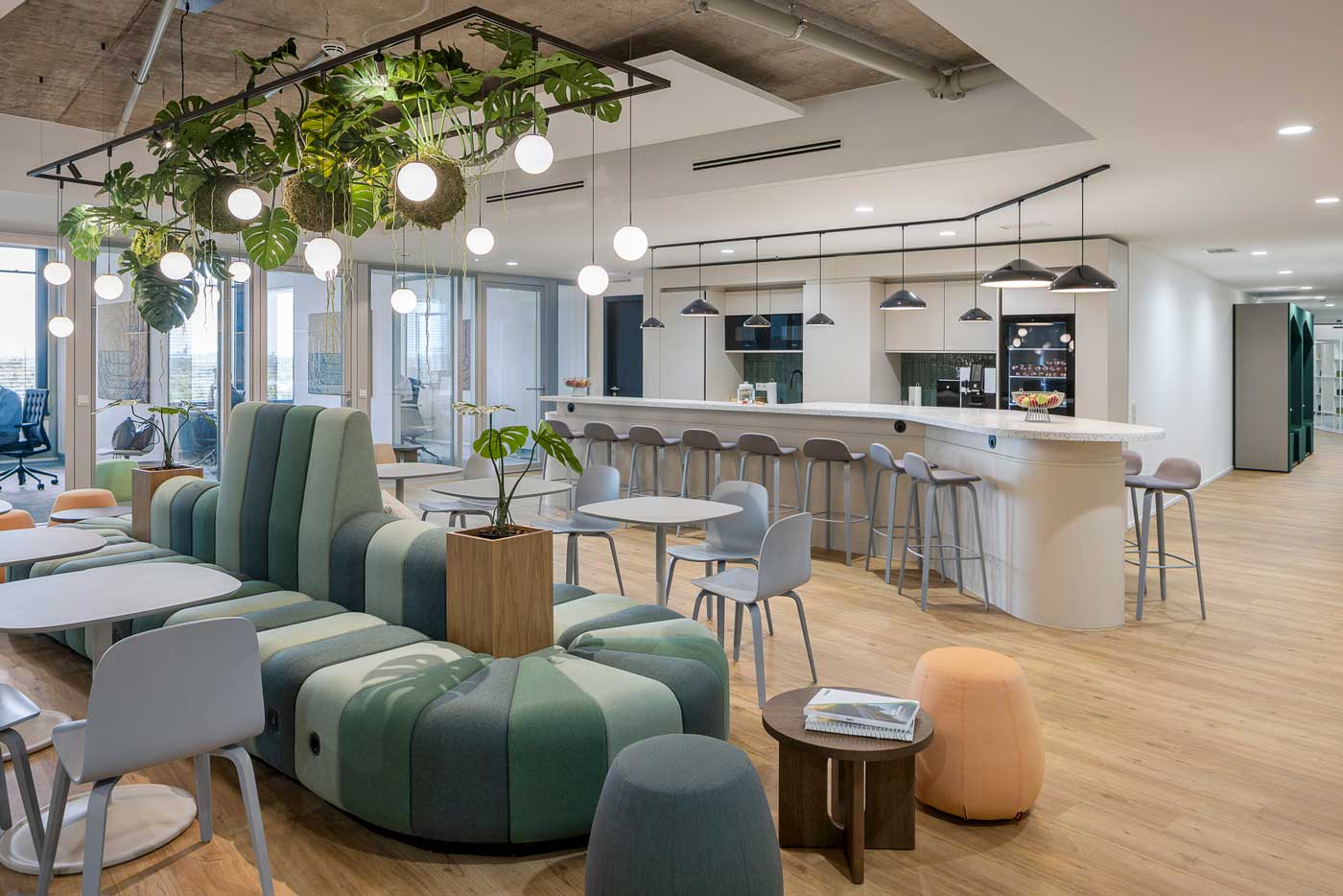 Das Arbeitskonzept folgt dem Prinzip des Activity Based Working. Entspannung und Produktivität sind bewusst miteinander verwoben. Das Herzstück bildet die Community Kitchen mit Bar und Loungebereichen als Ort für Begegnung und Austausch. Die Community Area lädt zum gemeinsamen Arbeiten, Besprechen oder Spielen ein. Ob Shuffleboard, Darts oder Playstation – hier entstehen Ausgleich und Inspiration gleichermaßen. Es kann gewählt werden zwischen ruhigem und lebendigem Arbeiten,