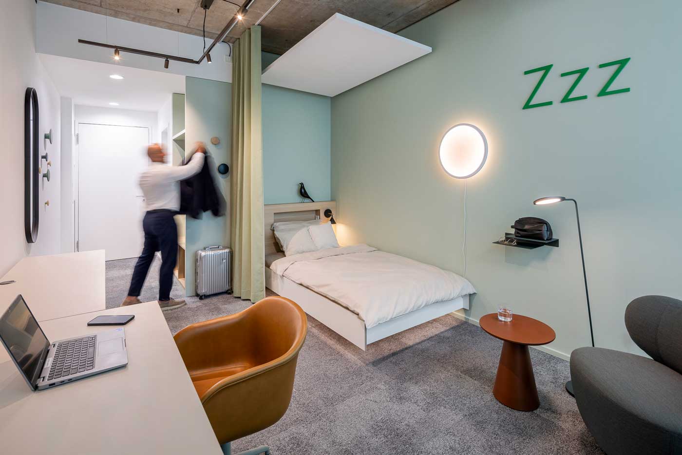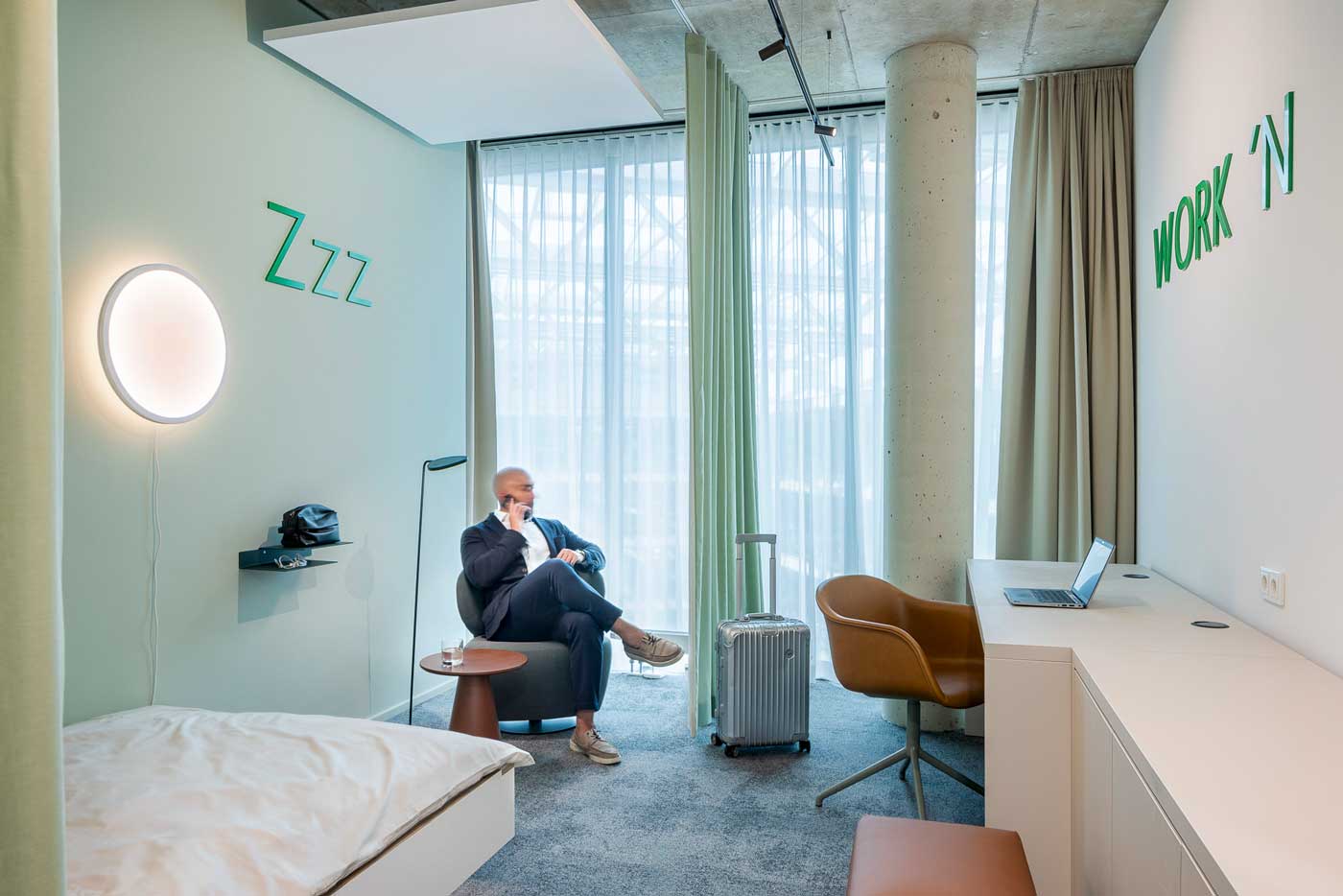 buchbaren Einzel- und Zweierbüros, Silent-Rooms für Fokus, Workshopraum für kreativen Austausch und Meetingräume für offizielle oder legere Besprechungen. Besonderes Highlight sind die Work & Sleep Räume, die internationalen Gästen und Mitarbeitenden Rückzug, Entspannung und legeres Arbeiten ermöglichen – auch hier in der besonderen Vossloh Designsprache.